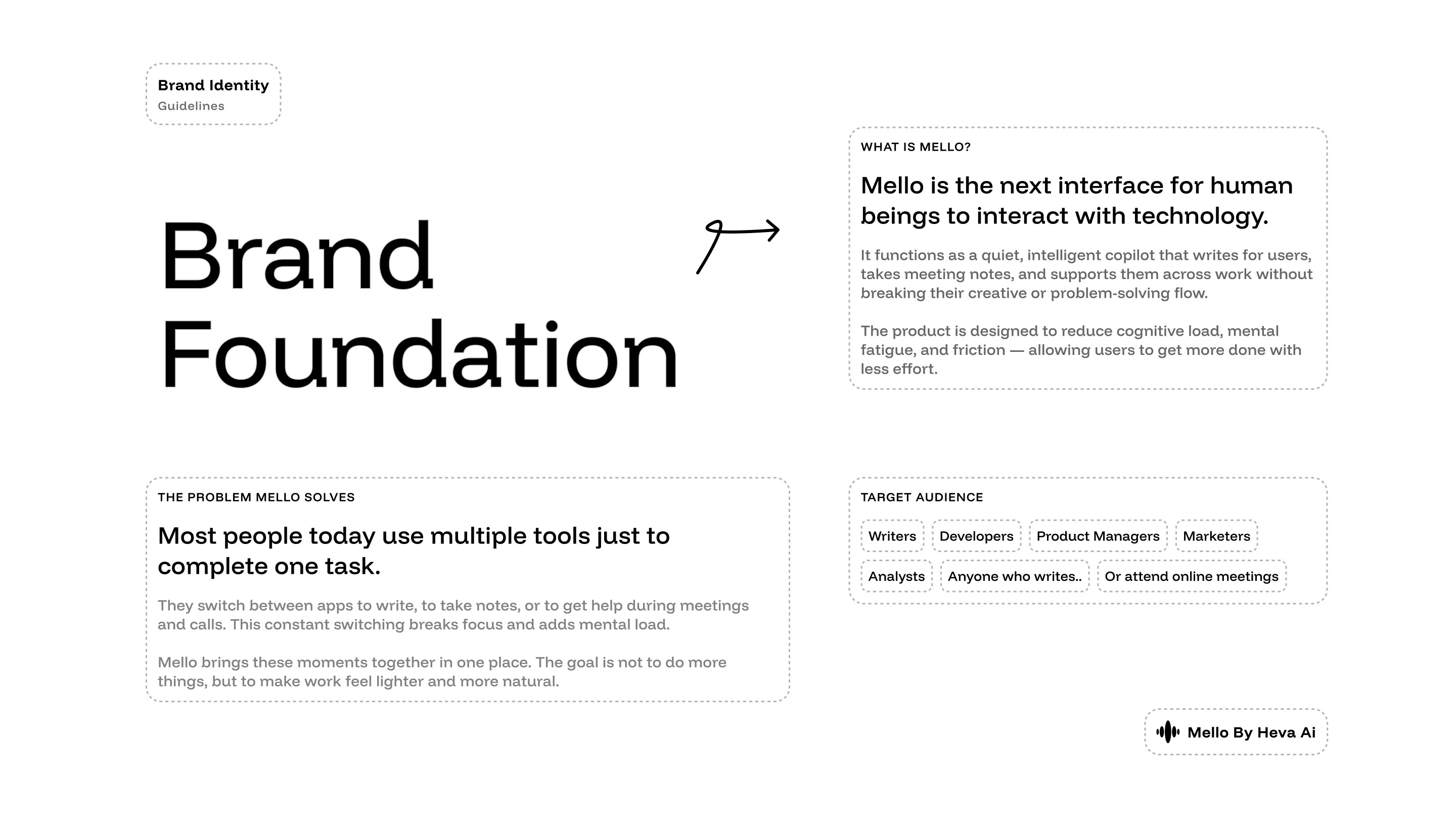 Mello was positioned as a calm, human-centric AI copilot, distinct from tools that feel overly technical or mechanical. The brand needed to feel modern, seamless, and emotionally reassuring — never demeaning or overwhelming.